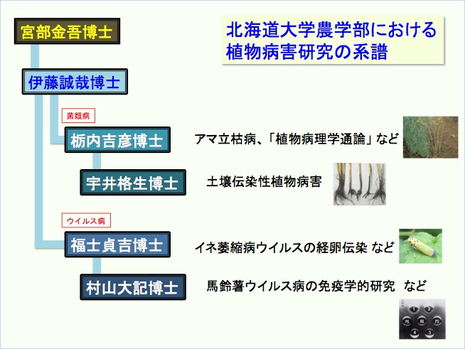 植物病理学研究室 (旧植物寄生病学講座)の起源は,明治以来北海道の植物病原菌の分類・生態研究、北日本の植物相の研究を行なってきた札幌農学校時代の植物学研究室(宮部金吾教授)です.