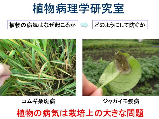 対象となる作物はアズキ, ダイズ, ジャガイモ, インゲン, イチゴ など多岐にわたっており, それぞれ病原菌の分類から生理・生態, 防除にいたる広い範囲の研究を行なっています. 作物の土壌伝染性病害をより深く, 統合的に理解することが私達の目標です.