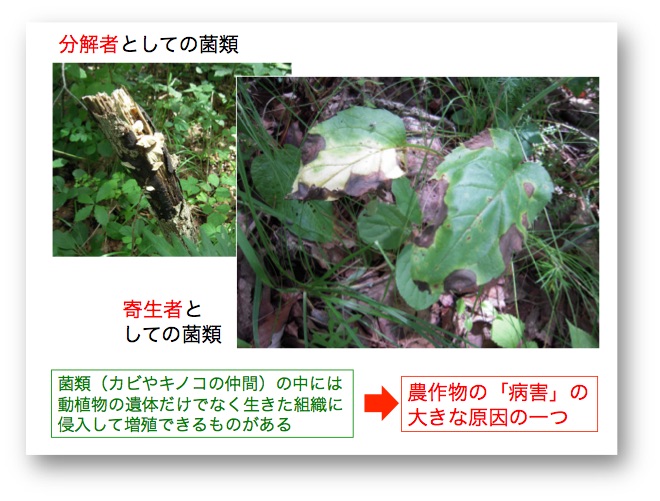 あなたはキュウリやトマトを育てたことがありますか?その時,葉の上に白い粉のようなものが付いているのを見ませんでしたか?「うどんこ病」はカビの仕業です.家庭菜園で野菜を作ってみるだけでも植物の病気が出てきます.農業の現場で,作物の病害は大きな問題です.私達の専門―植物病理学―はその病害に立ち向かうための学問です.